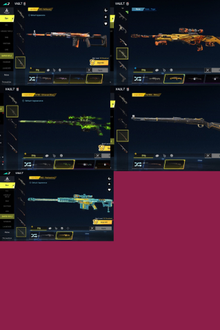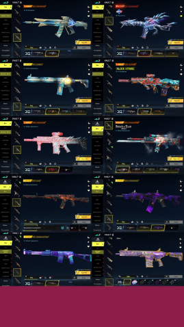 Kar98k — Glory✅ M82 — Radioactive ✅ M4A1 — Colossus Titan✅ KAG-6 — Violet Wraith✅ Spear — Pendulum of Fate✅ VSS — Pendulum of Fate✅ AK47 — Lava✅ Scar — Molten Core✅ AR97 — Bit Strike✅ Fal — Evolved Draco✅ Galil — Celestial vein✅ MCX — Twilight✅ INP-9 — Molten Core✅ Vector — Violet Wraith✅ URB — Blood Vengeance✅