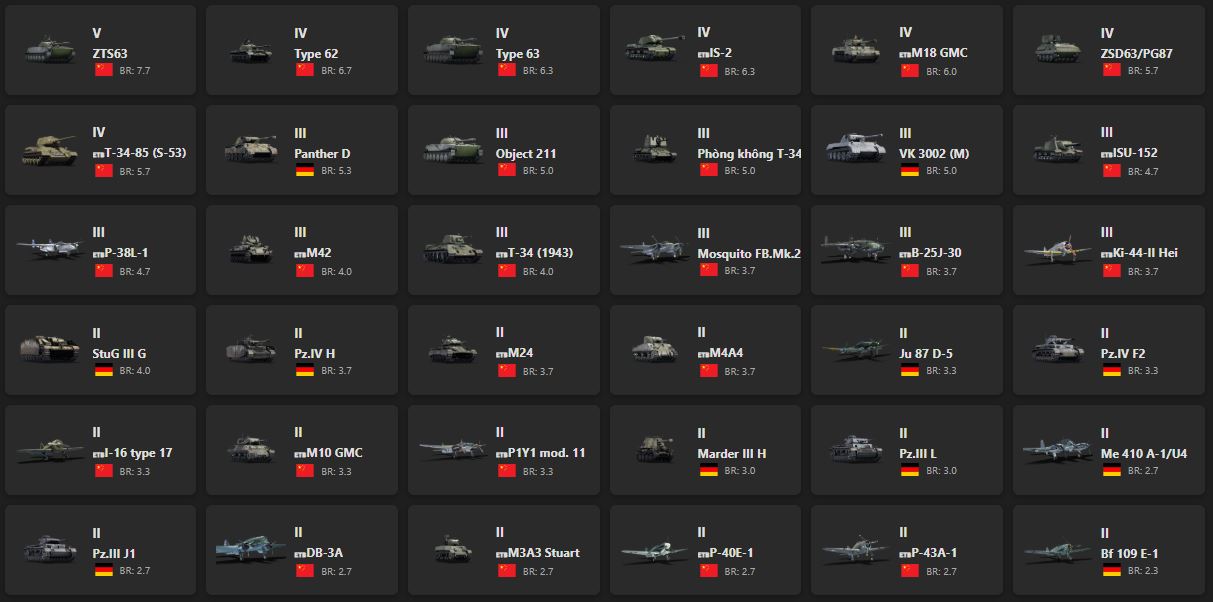 V - 1 ZTS63, Type 62, Type 63, IS-2, M18 GMC, ZSD63/PG87, Т-34-85 (S-53), Object 211
