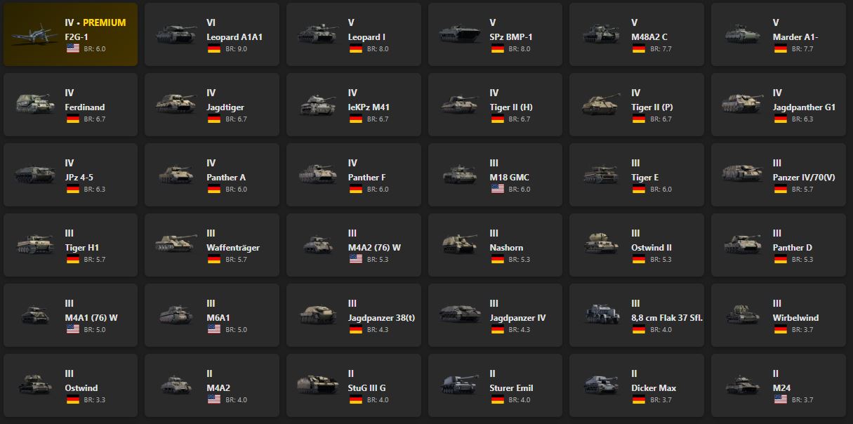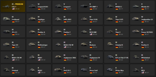 VI - 1, V - 4 F2G-1, Leopard A1A1, Leopard I, SPz BMP-1, M48A2 C, Marder A1-, Ferdinand, Jagdtiger, leKPz M41