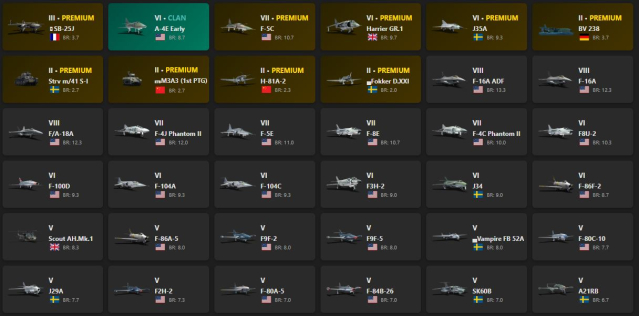 VIII - 3, VII - 5, VI - 10 F-16A ADF, F-16A, F/A-18A, A-4E Early, F-5C, Harrier GR.1, J35A, F-4J Phantom II