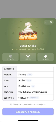 Тип подарка: ЗмеяКраткое описание: 🐍Змея🐍Lunar Snake🐍Frosting🐍 💯БЫСТРО БЕЗОПАСНО 100%💯
