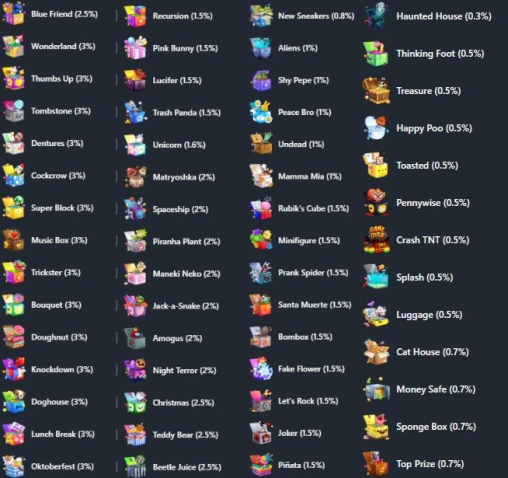 В лоте указана минимальная цена подарка — чаще всего это модели с шансом выпадения от 2% и выше ( Чем реже шанс выпадения модели, тем выше его стоимость.Так же важную роль играет цвет фона )