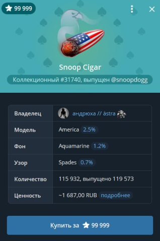 Тип подарка: СигаретаКраткое описание: 🗡---▶︎🛍️ПОДАРОК 🛍️SNOOP CIGAR AMERICA 🛍️ ФОН AQUAMARINE 🛍️◀ ---🗡 SNOOP CIGAR