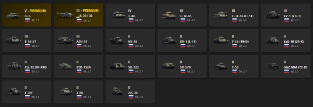 V - 1 IS-6, B-25J-30, T-44, T-34-85, T-34-85 (D-5T), KV-1 (ZiS-5), T-34-57, ASU-57, KV-1S, KV-1 (L-11)