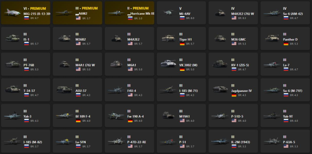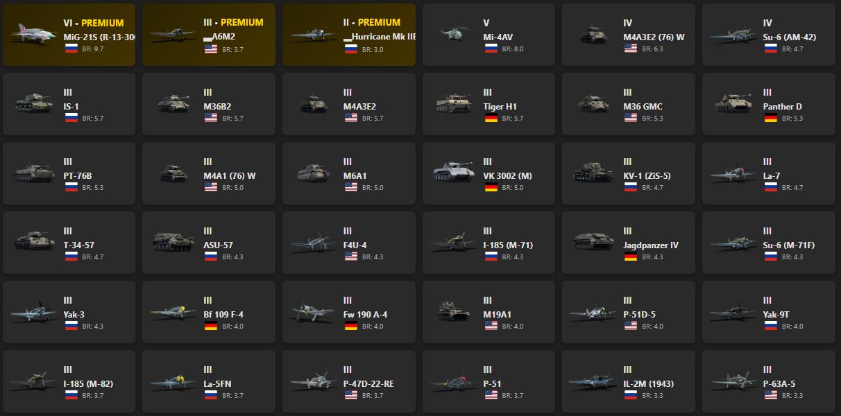 VI - 1, V - 1 MiG-21S (R-13-300), A6M2, Mi-4AV, M4A3E2 (76) W, Su-6 (AM-42), IS-1, M36B2, M4A3E2