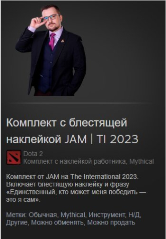 Подробное описание: Комплект от JAM на The International 2023. Включает блестящую наклейку и фразу «Единственный, кто может меня победить — это я сам».