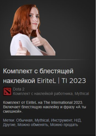 Подробное описание: Комплект от EiriteL на The International 2023. Включает блестящую наклейку и фразу «А ты смешной».