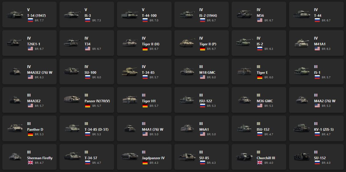 V - 3 T-54 (1947), IS-3, T-44-100, IS-2 (1944), M56, T-44, T26E1-1, T34, Tiger II (H), Tiger II (P), IS-2, M41A1