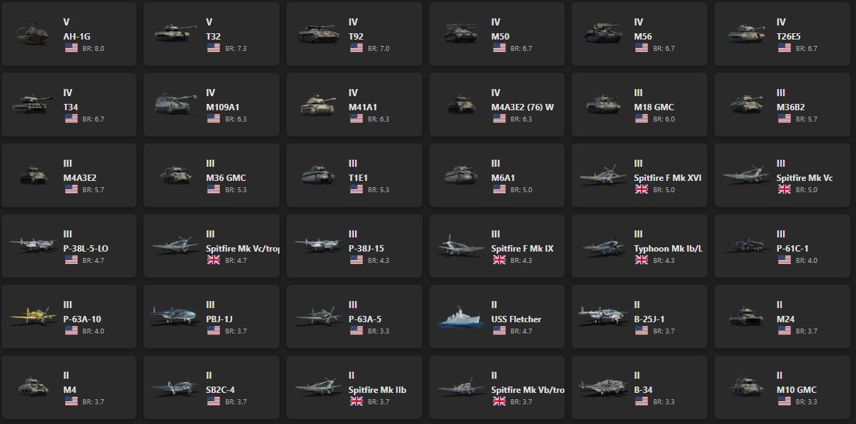 V - 2 AH-1G, T32, T92, M50, M56, T26E5, T34, M109A1, M41A1, M4A3E2 (76) W, M18 GMC, M36B2