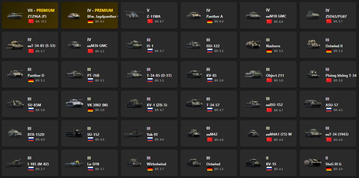 VII - 1, V - 1 ZTZ96A (P), Bfw. Jagdpanther G1, Z-11WA, Panther A, M18 GMC, ZSD63/PG87