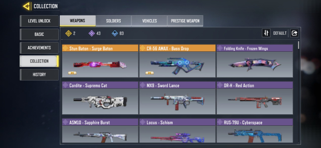 ◘ 🎯 Скины (на оружие): 2 легендарных, 43 эпических, 83 редких