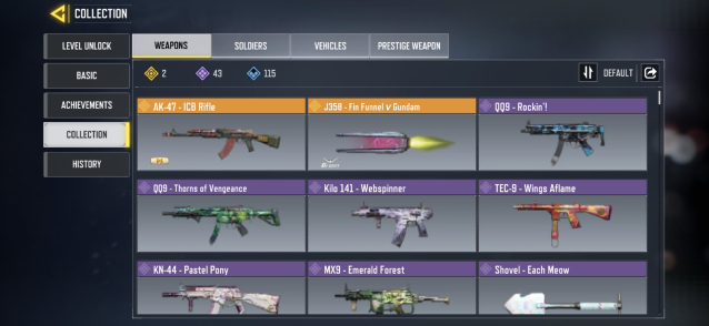 ◘ 🎯 Скины (на оружие): 2 легендарных, 43 эпических, 115 редких