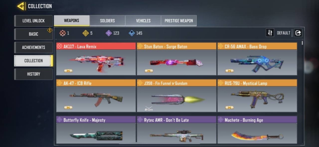 🔫 Skins Gun: 1 Mythic — 5 Legendary — 123 Epic — 145 Rare🔫