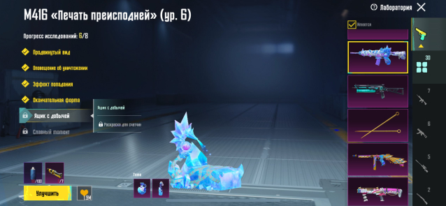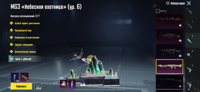 — Снайперские: M24 «Острие прогресса» (ур.4); SLR «Мелодия морских грёз» — фулл; SLR «Магический огонь» (ур.1); MK14 «Галактическая позолота» — фулл.