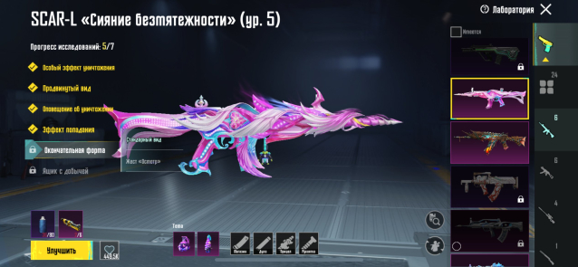— Штурмовые: M416 «Печать преисподней» (ур.5, граната, молик); SKAR-L «Сияние безмятежности» (ур.5, граната, молик); M762 «8-битный пони» (ур.4); Ace32 «Мистический кракен» (ур.4, граната, молик); MK47 «Экспериментальный кролик» — фулл; M16A4 «Колючий закат» — фулл.