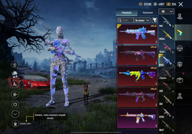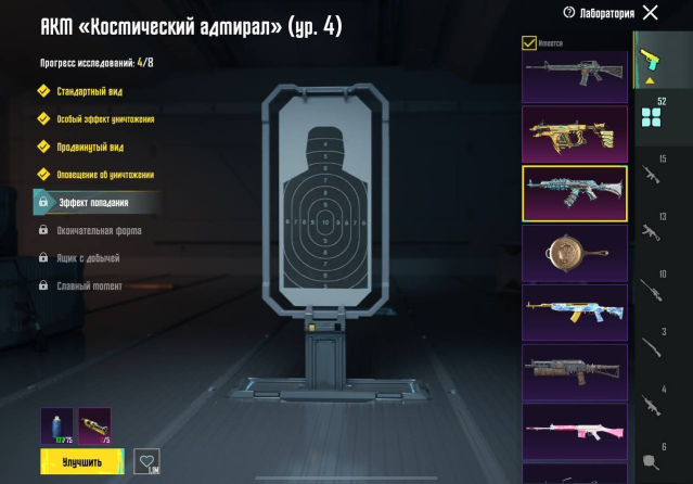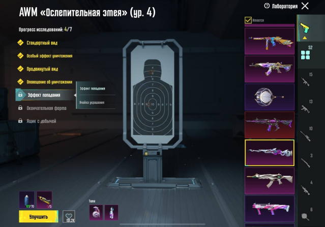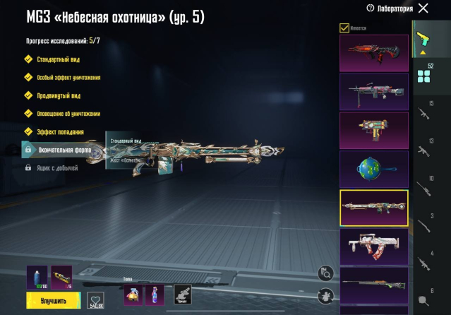 ❗ M762 «Сияющая Муза» – Уровень 6 → MGR3 «Небесная Охотница» – Уровень 5 → AUG «Рев Бездны» – Уровень 5 → АКМ «Космический Адмирал» – Уровень 4 → Томпсон «Карамельная Трость» – Уровень 4 → AWM «Ослепительная Змея» – Уровень 4 → ДП-28 «Цифрокотик» – Уровень 4