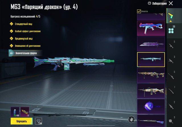 ❗ МК14 «Галактическая позолота» — Уровень 4 → MG3 «Парящий дракон» — Уровень 4 → UMP45 «Морская эволюция» — Уровень 3 → Томпсон «Изысканная сирень» — Уровень 3 → МК14 «Драконье господство» — Уровень 1 → ACE32 «Ледяной нарост» — Уровень 1