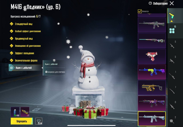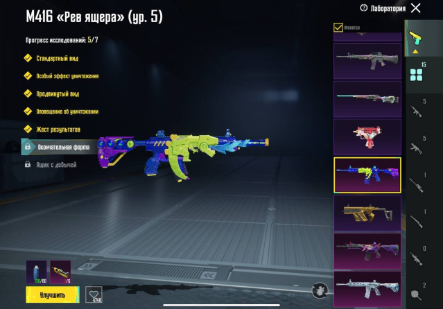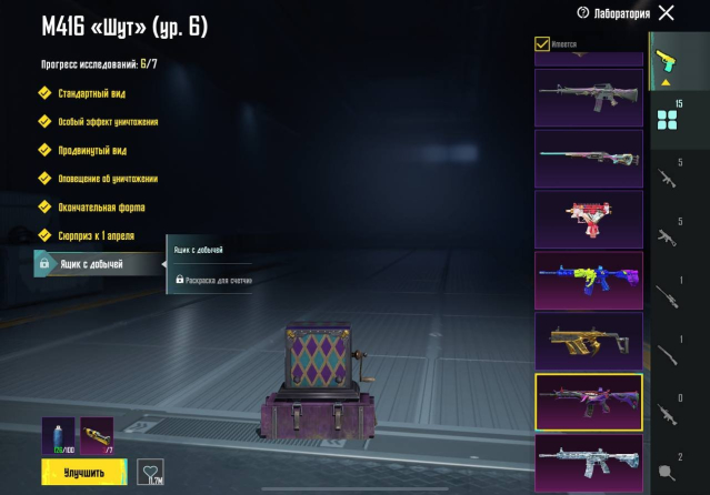 ❗ M416 «Шут» — Уровень 6 → M416 «Рев ящера» — Уровень 5 → Vector «Золотой граф» — Уровень 4 → M24 «Убойная мелодия» — Уровень 4 → UMP45 «Морская эволюция» — Уровень 3 → SCAR-L «Острая злоба» — Уровень 2