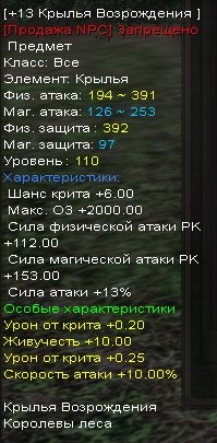 Сервер: Karos Reborn (karos.to) — PandoraКраткое описание: Крылья Возрождения +13 0.45 урона от крита + 10% СА