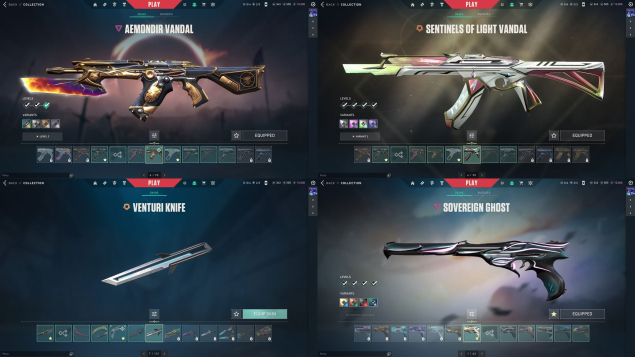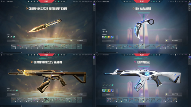 Champions 2025 Butterfly Knife | Ion Karambit | Champions 2025 Vandal | Blade of Serket | .SYS Melee | Venturi Knife | Sentinels of Light Vandal | Sovereign Ghost | Reaver Operator | Aemondir Vandal | Ion Vandal | Reaver Spectre | Transition Shorty | Sandswept Sheriff | Venturi Spectre | Overlay Sheriff | Comet Ghost | .SYS Stinger | Bubble Pop Classic | .SYS Vandal | Byteshift Ghost | .SYS Bucky | Venturi Marshal | Tilde Shorty | Venturi Vandal | Abyssal Sheriff | Venturi Frenzy | .SYS Sheriff | Eclipse Ghost | Monstrocity Sheriff | 9 Lives Ares | Coalition: Cobra Odin | Coalition: Cobra Marshal | Snakebite Shorty | Celestia Ghost | Hue Shift Shorty | Gridcrash Stinger | RagnaRocker Frenzy | 9 Lives Guardian | Gridcrash Ghost | Gridcrash Judge | Hue Shift Phantom | 9 Lives Phantom | Wunderkind Shorty | Gridcrash Bulldog | Retrowave Sheriff | Hue Shift Bulldog | Digihex Ghost | Vendetta Ghost | Death Wish Sheriff | Coalition: Cobra Judge | Smite Classic | Fiber Optic Ghost | Nanobreak Sheriff | Coalition: Cobra Frenzy | 9 Lives Classic | Hue Shift Spectre
