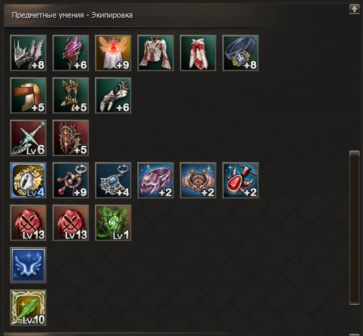 Дополнительные предметы: верх низ охотника лайт +5, +8 благой плащ (3ур.), +5 благой пояс, шлем маны +4, перчи оглушения +4, сапоги уклонения +4, эйнхасад +5, подвеска питомца +3, символ фатальности +3, шилен +3 (2 шт), паагрио +5 (2шт), венец +4, серьга питомца, кольцо питомца +1
