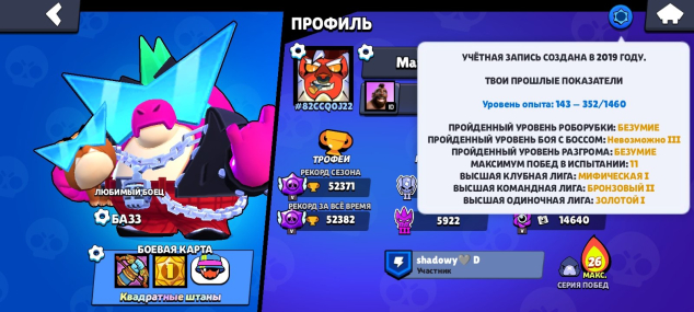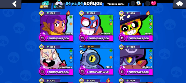 Аккаунт Brawl Stars, созданный в 2019 году. Куплено 5 Brawl Pass, много эксклюзивных скинов. 6 мифических скинов. Скины на 20000 гемов. 52500 кубков, 94 бравлера, 27 «11» сил и 27 макс рангов. Присутствует вторая слава. 4 титула.