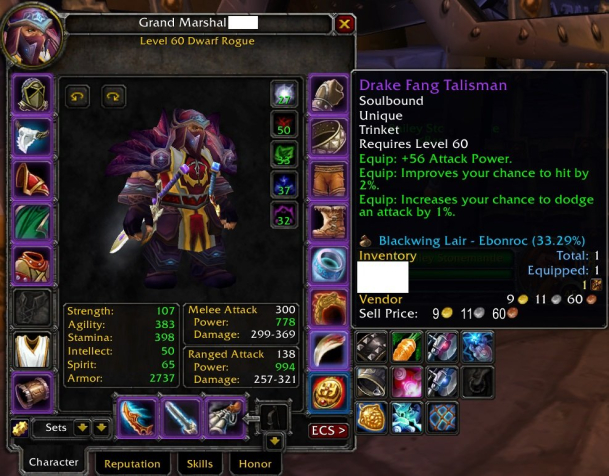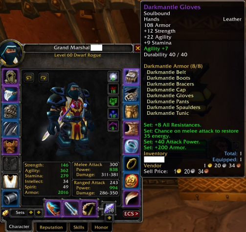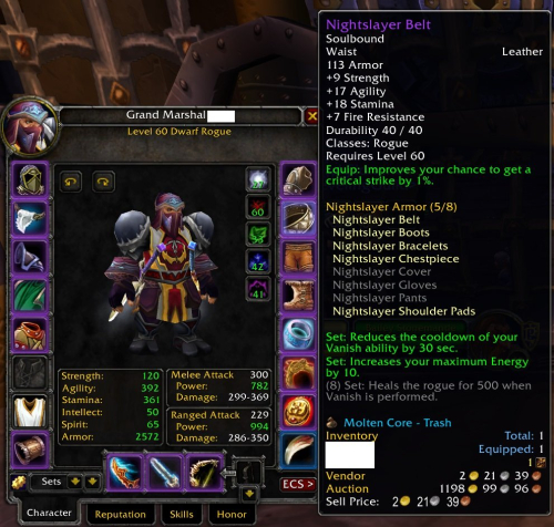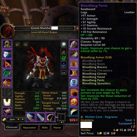 Onyxia Tooth Pendant (Onyxia), Cloak of the Shrouded Mists (Ragnaros), Boots of the Shadow Flame (Nefarian), Archimtiros' Ring of Reckoning (Nefarian, лучшее PVP кольцо до конца ванилы), Don Hulio Band, Cape of the Black Baron (Baron Rivendare), Tarnished Elven Ring (DMT), Onyxia Scale Cloak (for BWL), Bracers of the Eclipse (DMW), Mugger's Belt (DMN, +5 daggers skill).