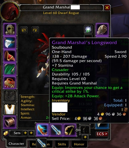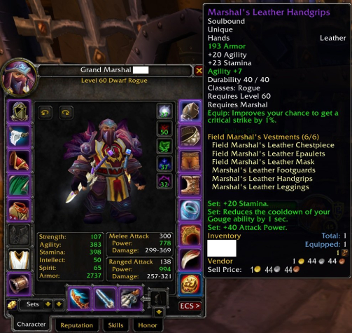 R14 swords Grand Marshal's Longsword (Crusader) + Grand Marshal's Swiftblade (Crusader), Grand Marshal's Swiftblade (+15 agility), Grand Marshal's Dirk (Crusader), Core Hound Tooth (+15 agility). BiS ranged weapon: Strikers Mark (BiS для PVE) and Blastershot Launcher (очень хорошее для PVP). Также вы можете купить любое другое оружие за ранг 14 – мэйсы, кистевое и другое. Вы можете играть с мечами или кинжалами, как вам больше нравится.