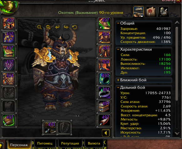 ПВЕ Хант 496гир. кож 600,чарка600.+ ДК-494 инжа581, шитьё600. 22,10,25., 90 уровень, Пандарены, Охотник