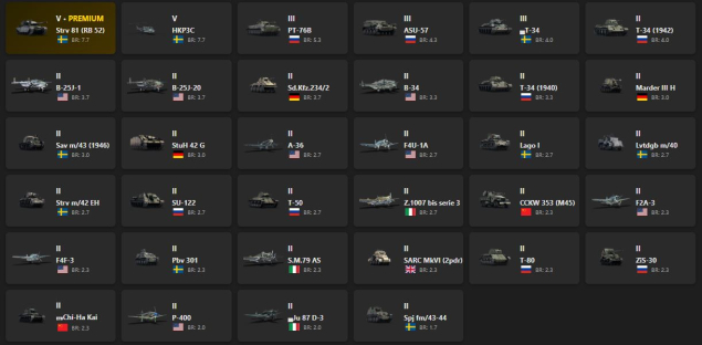 V - 2 Strv 81 (RB 52), HKP3C, PT-76B, ASU-57, T-34, T-34 (1942), B-25J-1, B-25J-20