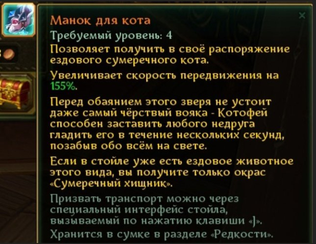 Позволяет получить в своё распоряжение ездового сумеречного кота. Увеличивает скорость передвижения на 155%. Перед обаянием этого зверя не устоит даже самый чёрствый вояка — Котофей способен заставить любого недруга гладить его в течение нескольких секунд, позабыв обо всём на свете.