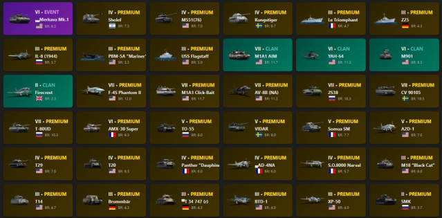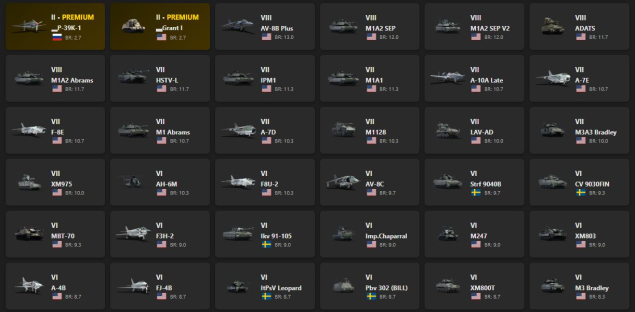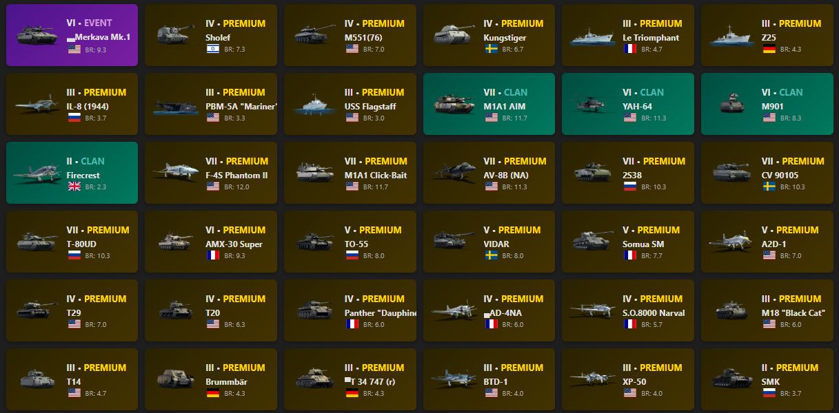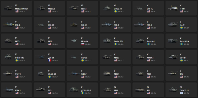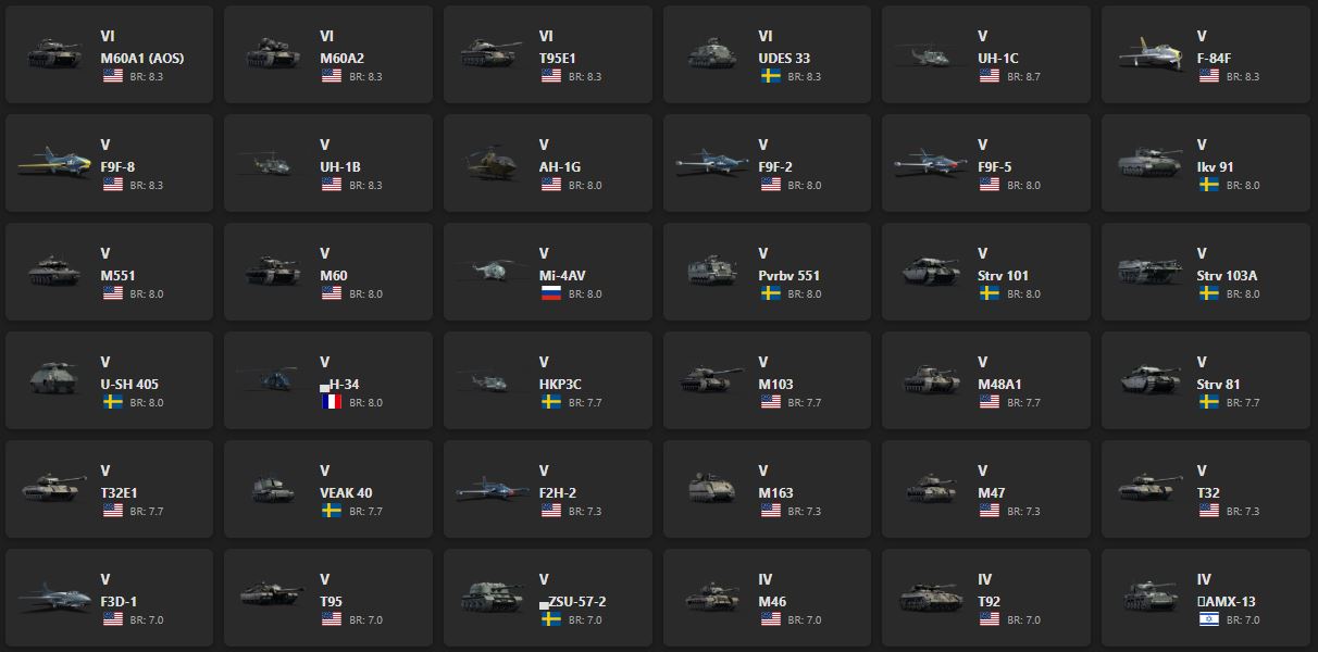 ▃Merkava Mk.1, Sholef, M551(76), Kungstiger, Le Triomphant, Z25, IL-8 (1944), PBM-5A «Mariner», USS Flagstaff, M1A1 AIM, YAH-64, M901, Firecrest, F-4S Phantom II, M1A1 Click-Bait, AV-8B (NA), 2S38, CV 90105, T-80UD, AMX-30 Super, TO-55, VIDAR, Somua SM, A2D-1, T29, T20, Panther «Dauphiné», ▄AD-4NA, S.O.8000 Narval, M18 «Black Cat», T14, Brummbär, ▀T 34 747 ®, BTD-1, XP-50, SMK, ▂P-39K-1, ▃Grant I, AV-8B Plus, M1A2 SEP, M1A2 SEP V2, ADATS, M1A2 Abrams, HSTV-L, IPM1, M1A1, A-10A Late, A-7E, F-8E, M1 Abrams, A-7D, M1128, LAV-AD, M3A3 Bradley, XM975, AH-6M, F8U-2, AV-8C, Strf 9040B, CV 9030FIN, MBT-70, F3H-2, Ikv 91-105, Imp.Chaparral, M247, XM803, A-4B, FJ-4B, ItPsV Leopard, Pbv 302 (BILL), XM800T, M3 Bradley, M60A1 (AOS), M60A2, T95E1, UDES 33, UH-1C, F-84F, F9F-8, UH-1B, AH-1G, F9F-2, F9F-5, Ikv 91, M551, M60, Mi-4AV, Pvrbv 551, Strv 101, Strv 103A, U-SH 405, ▄H-34, HKP3C, M103, M48A1, Strv 81, T32E1, VEAK 40, F2H-2, M163, M47, T32, F3D-1, T95, ▄ZSU-57-2, M46, T92, AMX-13, Bkan 1C, M26, M50, M56, Pbv 501, T-44, T26E1-1, T26E5, T34, Zachlam Tager, AMX-10P, ASU-85, F7F-1, F8F-1B, IS-2, M-51, M109A1, M41A1, M4A3E2 (76) W, M53/59, Rochev, T25, ▄Charioteer Mk VII, AD-4, BTR-ZD, CA Lorraine, ELC bis, M4/T26, M109, AD-2, F4U-4B, Strv 74, T-34-85, ▄T-34-85, U-SH 204 GK, A-26B-10, F4U-1C, Lvkv 42, M18 GMC, IS-1, M36B2, M4A3 (76) W, M4A3E2, T1E1 (90), TPK 6.41, ▄M36B2, ▄M4A3E2, ARL-44, E.B.R. (1951), ISU-122, M36 GMC, M4A2 (76) W, PT-76B, T-34-85 (D-5T), T1E1, ▄PT-76, AMX-13 DCA 40, IJN Hatsuzuki, KV-85, M4A1 (76) W, M6A1, Pvkv m/43 (1963), Strv m/42 DT, SU-85M, B-17E, F8F-1, ISU-152, KV-1 (ZiS-5), T-34-57, AMX-13 (FL11), ASU-57, B-26B, F4U-4, F6F-5N, Jagdpanzer 38(t), Jagdpanzer IV, SU-85, 8,8 cm Flak 37 Sfl., BTR-152D, Ikv 103, M19A1, M42, M44, P-61C-1, P-63A-10, P-63C-5, Pvkv II, Pvkv m/43 (1946), SU-152, Yak-9K, Yak-9T, ▄T-34, ARL-44 (ACL-1), PBJ-1H, PBJ-1J, ▄Pz.IV, IL-2M (1943), L-62 ANTI II, P-63A-5, Pvkv IV, KV-1S, M4A2, StuG III G, Sturer Emil, T-34 (1941), T-34 (1942), T-34E STZ, T77E1, B-25J-1, B-25J-20, Dicker Max, KV-1 (L-11), KV-2 (1939), M24, M4, Pz.IV H, SARC MkVI (6pdr), Sd.Kfz.234/2, B-34, F6F-5, M10 GMC, M4A1, P-38G-1, Pvkv III, Pz.III M, Pz.IV F2, Pz.IV G, Sd.Kfz.251/21, StuG III F, T-34 (1940), YaG-10 (29-K), ZiS-12 (94-KM), ZSU-37, ▄M10 GMC, Crusader III, D.520, F4F-4, IL-2 (1942), LeO 451 early, M4A3 (105), Marder III H, N.C.223.3, P-38E, Pz.III L, Sav m/43 (1946), SB2C-1C, StuH 42 G, VTT DCA, Yak-9, ZiS-43, ▄M4A3 (105), A-20G-25, A-36, Archer, BTR-152A, Crusader II, F4U-1A, Lago I, Lvtdgb m/40, M16 MGMC, M3 Lee, M5A1, P-36G, P-39N-0, P-39Q-5, P-40E-1, P-40F-10, Pe-3bis, Pz.III J1, Strv m/41 S-II, Strv m/42 EH, SU-122, SU-57B, T-50, V.G.33C-1, Yak-7B, ▄Crusader Mk.II, ▄M3A3 Stuart, 2C, B1 bis, C. 200 serie 3, CCKW 353 AA, F2A-3, F4F-3, GAZ-MM (72-K), IL-2 (1941), M.S.410, Pbv 301, SARC MkVI (2pdr), T-28E, T-80, Yak-1, ZiS-30, ◗Fokker G.IA, Hs 129 B-3, LaGG-3-8, P-400, Spj fm/43-44