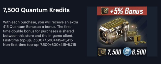 Краткое описание: ✅ 🟣 8715 Quantum Kredits 💎 (15415 Quantum Kredits с х2) 🟣 По ID, без входа в акк ⭐⭐⭐⭐⭐