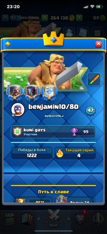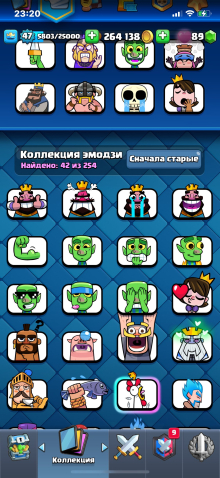 Подробное описание: 9511 кубков,89 гемов,264к золота,47 лвл, все карты кроме монаха и императрицы духов,24 арена,3 карты 15 уровня,3 карты 14 уровня,42 эмоции