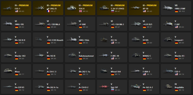 VII - 1, VI - 5, V - 24 F2G-1, TOG II, MiG-21MF, MiG-19S, CL-13B Mk.6, F-86K, Maus
