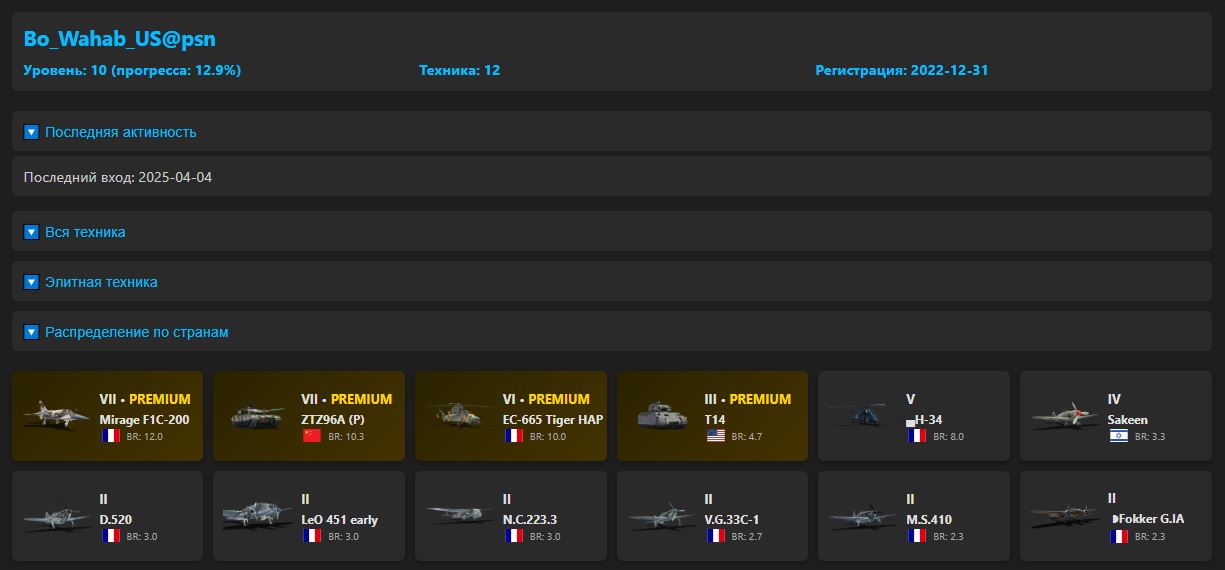 ДАННЫЕ ИДУТ ОТ АККАУНТА WAR THUNDER.COM