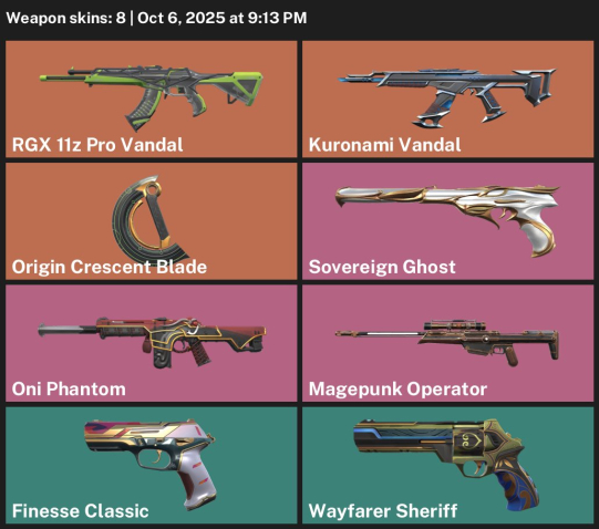 📸 Полный список смотри на скриншоте (Нож, Vandal «Куронами», Vandal «RGX 11z Pro», Operator «Чаропанк»)