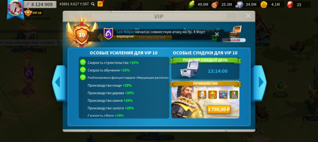 Подробное описание: Королевство 3991, 8.3 М. мощи, вип 10, открыты все т4, есть Паспорт, до 1 КВК +-25 дней, 100м+ ресурсов, есть ферма 1кк мощи, поставка 19 дней, Фонд роста куплен, на 25 ур. упадёт 40к самоцветов.
