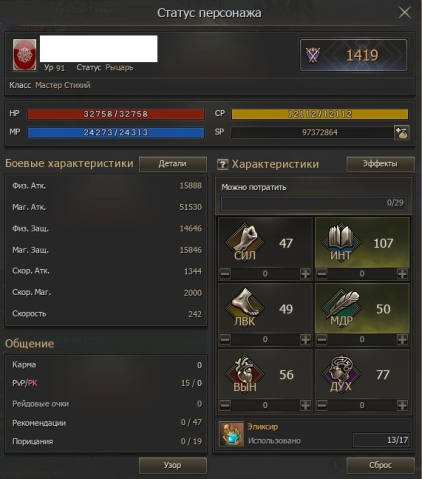 Профессия: Мастер Стихий (Коневод), ГС 1419, ГК (+3), Небесный Плащ (+1)