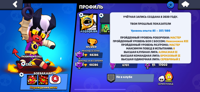 📅 Создан в 𝟐𝟎𝟐𝟎 | 🔥 𝟐𝟒𝟕 скинов | 💪 𝟗𝟒/𝟗𝟓 бравлеров (𝟐𝟒 на 11-й силе)