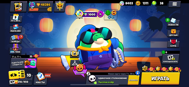 • 𝟏𝟑𝟏𝟏 монет 💰 / 𝟑𝟖 гемов 💎 / 𝟖𝟒𝟎𝟑 блингов 🎟️ / 𝟏𝟔𝟓𝟓𝟕 очков силы 🌟