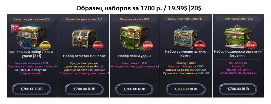 Если Вы видите у меня дублирование или похожие предложения, но с разными ценами — не беспокойтесь. Это означает, что один и тот же типовой товар (валюта, предметы, услуги) предлагают несколько разных игроков, которым он достаётся разными усилиями (кто-то фармит валюту/предметы вручную, кто-то владеет ботофермами и т.п. случаи).