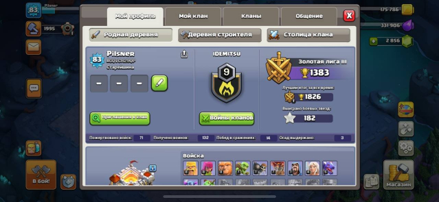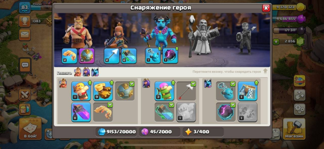 Уровень Ратуши: 11Краткое описание: 💫ЛИЧНЫЙ💫 💎3069 ГЕМОВ💎 11 ТХ💫5👨🔧💫ГЕРОИ 9/20/1/1✅1 ОФОРМЛЕНИЯ✅1 СКИН НА КОРОЛЯ «НОВОГОДНИЙ»💫
