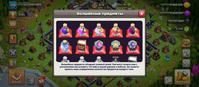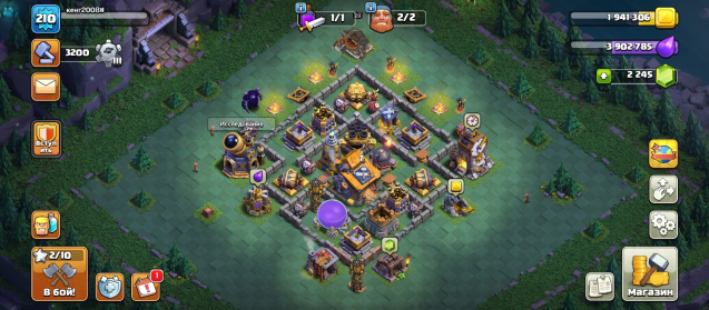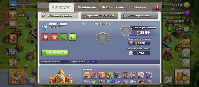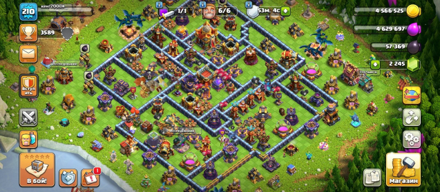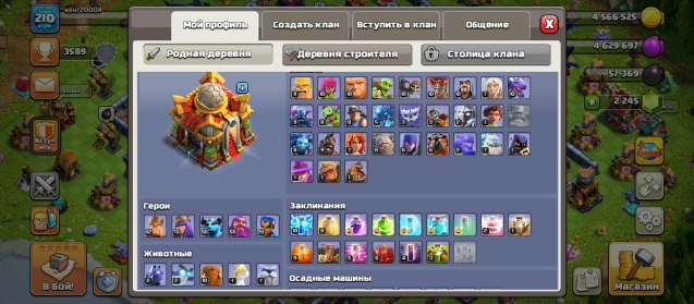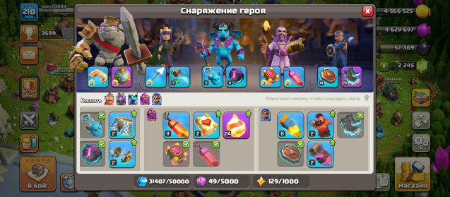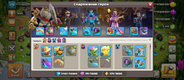Уровень Ратуши: 16Краткое описание: 16 TH • 210 LEVEL • ГЕРОИ 62/70/56/55/20 • 2 СКИНА • 3 ЭПИК СНАРЯГИ • 6 РАБОВ • 2245 ГЕМОВ