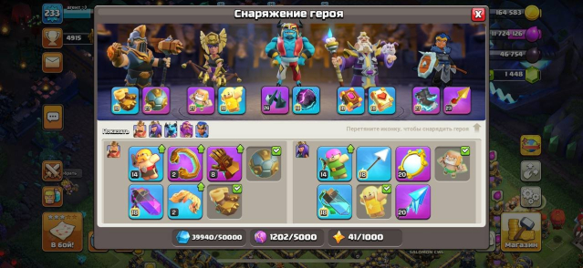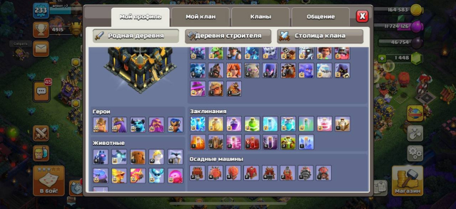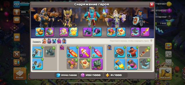 Уровень Ратуши: 17Краткое описание: 🔥17 ТХ ФУЛЛ 100% (233 lvl)🧨100/100/90/75/50🧨 6 СТРОИТЕЛЕЙ🧨11 ЭПИК СНАРЯГ, 1 ОФОРМЛЕНИЕ, 13 СКИНОВ🔥