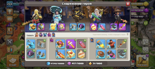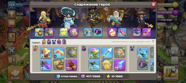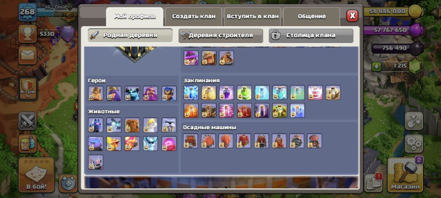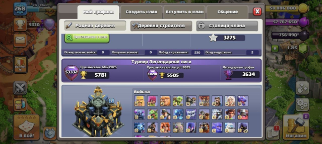 Уровень Ратуши: 17Краткое описание: ⚡️17𝐓𝐇 FULL 100%【268𝐋𝐕𝐋】⚡️💎8 ЭПИК СНАРЯГ💎🔵【ГЕРОИ 100/100/75/50】🔵 💙3 ОФОРМЫ + 26 СКИНОВ💙🍀ПП🍀