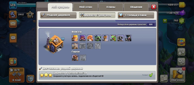 Уровень Ратуши: 11Краткое описание: 🏰【11 TX】🏡【7 БХ】🏆【124 LVL】🔥【Мощная база】🎭【Скины на героев】🔐【Смена почты】