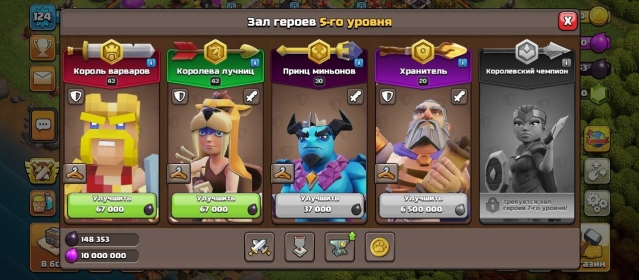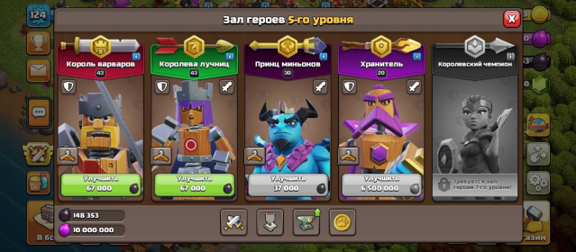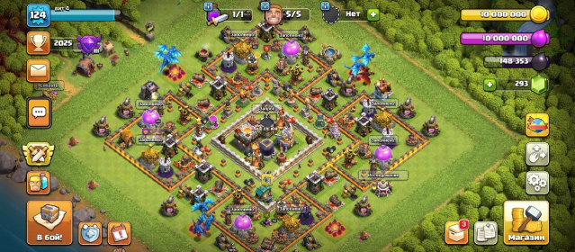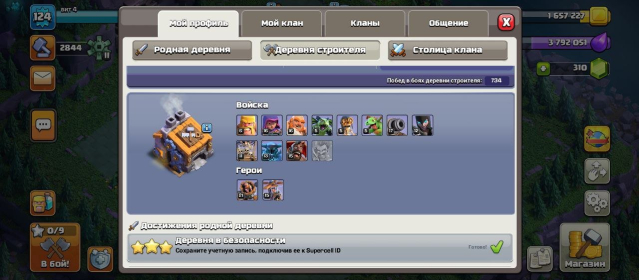 Уровень Ратуши: 11Краткое описание: 🏰【11 TX】🏡【9 БХ】🏆【124 LVL】👑【ФУЛЛ 90%】🎭【КУЧА СКИНОВ】🔐【Смена почты】