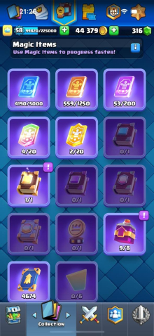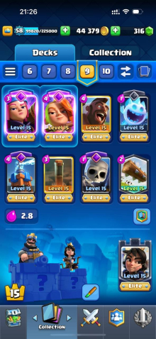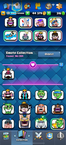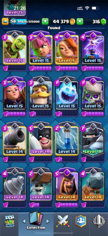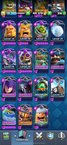 Краткое описание: 12 к 🏆, 58 лвл, 15 15 лвл + 56 14 лвл, колода хог 2.8, 11 эволюций, 98 эмодзи, описание 👇