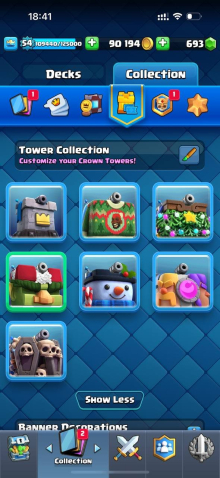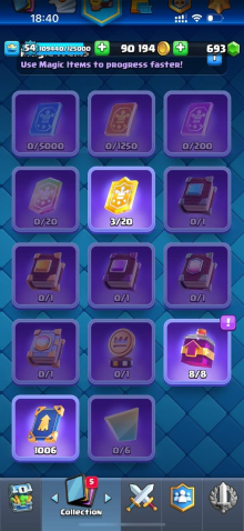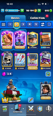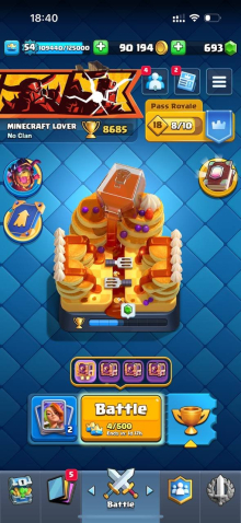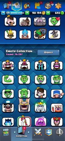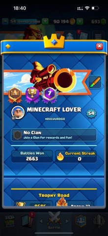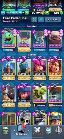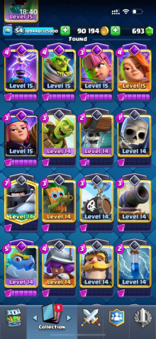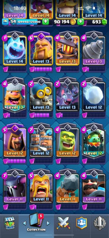 Краткое описание: 8.6 к 🏆, 54 лвл, 8 карт 15 лвл + 23 14 лвл, колода с шаром, 8 эволюций, 76 эмодзи, описание 👇